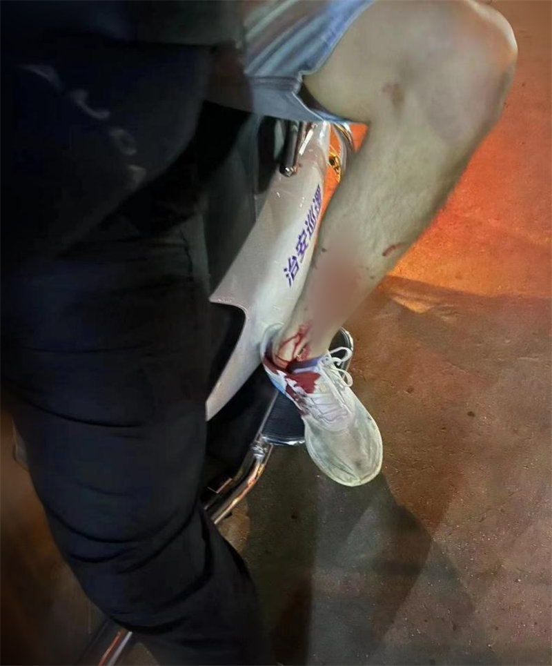 6月14日深夜,在建大雁塔校园,一名学生骑行时不慎摔倒,路过的同学急忙把翟恒辉搀扶到门卫处。事件发生后,学校安保部门迅速接到报告,并立即启动应急预案。项目班长柴朝选紧急组织救援力量,驾驶巡逻车火速赶往现场。到达现场后,看到翟同学左腿鲜血直流,急需就医治疗。柴朝选立即上前安抚学生情绪,并小心翼翼地将学生扶上巡逻车,送往最近的986医院。